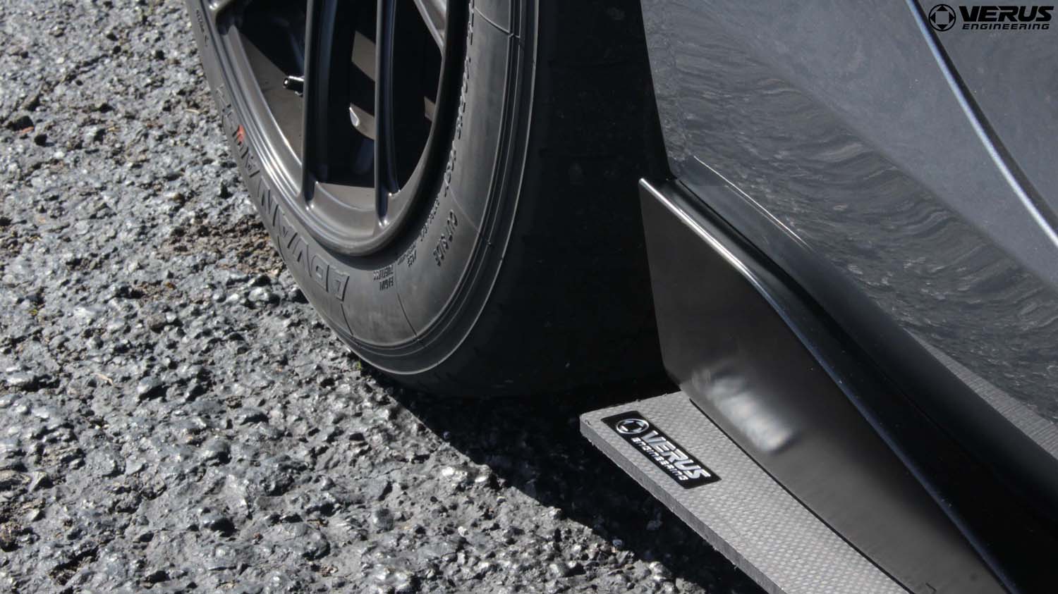 The Verus Engineering Carbon Polyweave Side Splitter Kit completes the aerodynamic appearance of your Mk5 Toyota Supra. These units were designed specifically to flow with the factory side-splitter and feature a horizontal member which reduces the amount of high-pressure air making its way to the bottom side of the vehicle. This high-pressure air produces lift and by reducing this, we reduce lift on the chassis. This is specifically prevalent while the vehicle is in yaw or while turning.