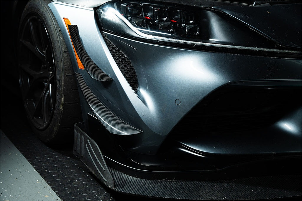 The Verus Engineering Dual Dive Planes Kit for the A90 MKV Toyota Supra was specifically designed to increase front-end downforce while keeping drag increase to a minimum. The units work together to aid in extracting airflow from the wheel well, as well as produce downforce themselves on the front axle of the car.