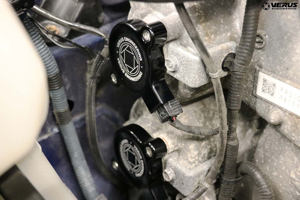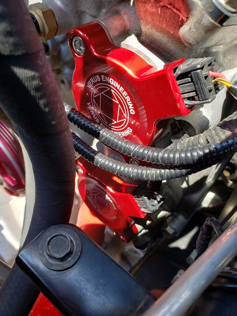 Shield your plastic cam actuator connectors from damage and improve the look of your engine bay with our Front Cam Sensor Cover Kit. These units are crafted out of billet aluminum in the USA, bright dip anodized one of three popular colors, and then laser engraved.  The units install painlessly in minutes with simple hand tools. Price is for a set of (4) units.