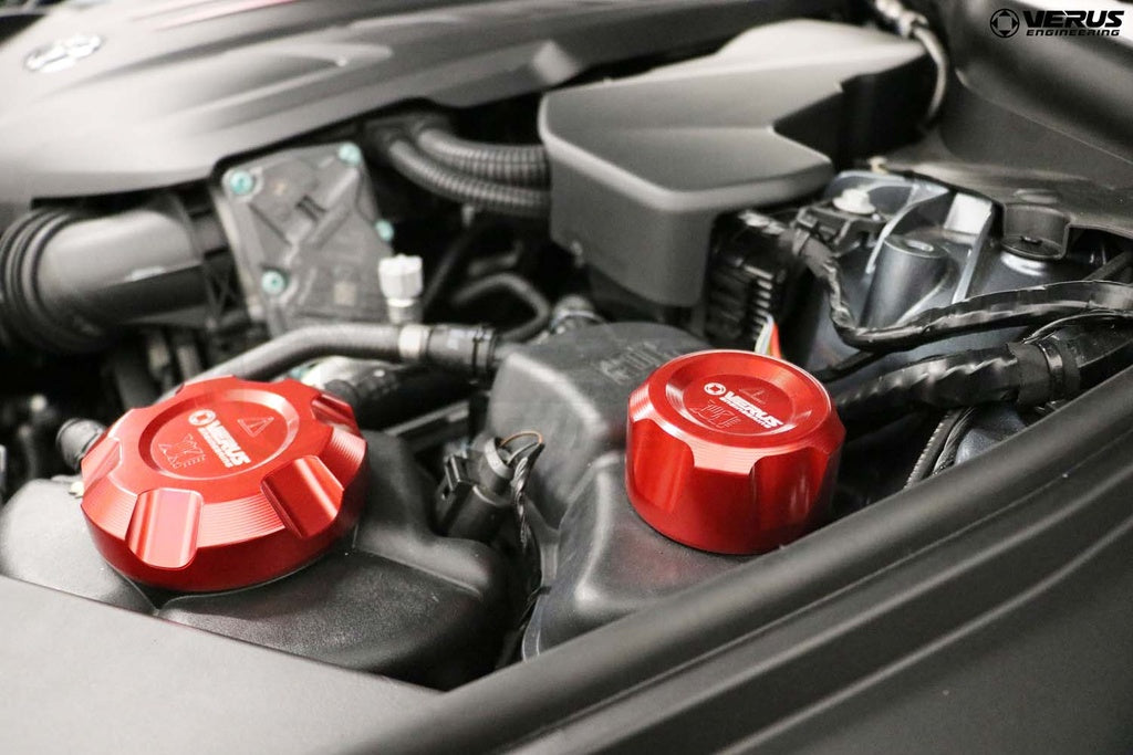 Cover up the lackluster plastic caps that come on your factory Toyota Supra with a cap machined in house from solid aluminum. The caps are offered in three common colors to add color to the engine bay.  The units install easily within minutes with no tools required.